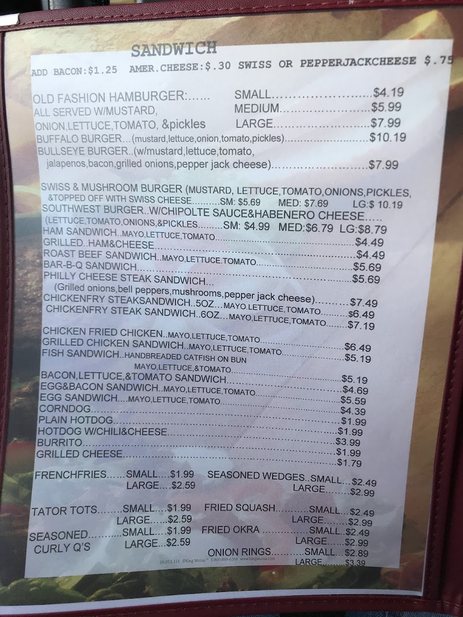 The menu features a delightful array of offerings. From classic old-fashioned hamburgers to scrumptious Philly cheese steaks, each item is crafted with fresh ingredients. Don't miss the standout Buffalo burger praised for its quality and fresh toppings, or the giant sausage biscuit that has gained a loyal following. Side options like fried okra and curly fries add a comforting touch to any meal.
